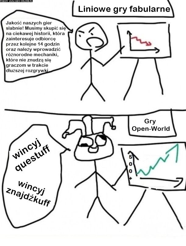 Ciezko sie nie zgodzic z filmikiem, bezblednie punktuje wszystkie debilizmy zwiazane z niepotrzebnym wciskaniem otwartych swiatow do kazdej gry. Co cieszy to fakt, ze zazwyczaj gracze debilami nie sa, potrafia docenic dobrze zrobione otwarte swiaty (Zelda, Horizon), potrafia olac te slabe (Homefront, Mafia3). Ale nie zawsze to dziala i czasem jakis szrot niestety osiagnie sukces.