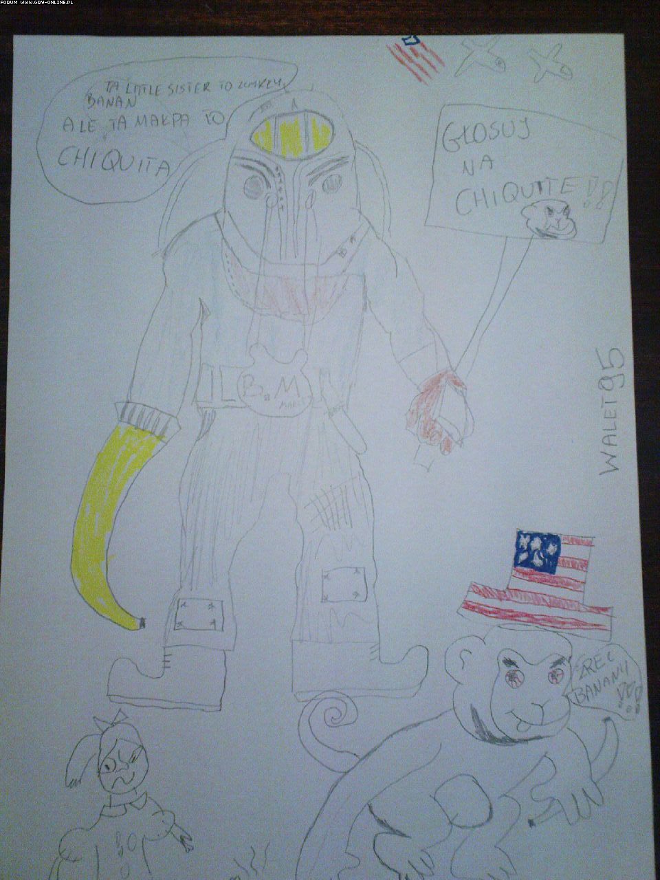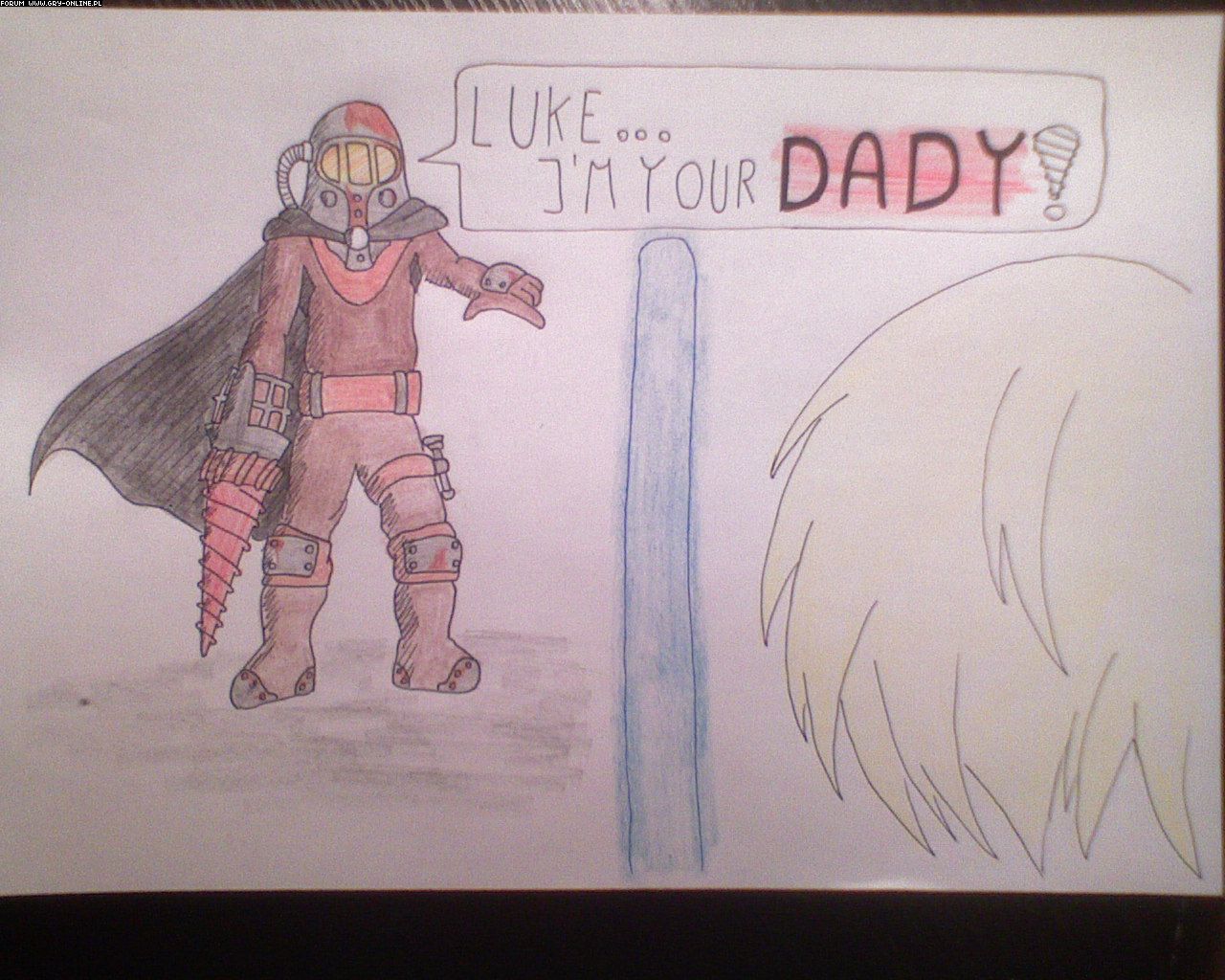 Nie wiem z czego się tak śmiejesz. Jak dla mnie to twoja 3 praca jak nic wygląda na wydrukowany i odkalkowany rysunek z internetu. Wszystko się zgadza. Takie same położenie i proporcje Big Dadiego na kartce, każdy element dokładniusieńko taki sam. Chyba nie o to chodziło w tym konkursie. Nikt nie zabrania wzorować się na jakimkolwiek innym rysunku, ale takie coś raczej nie jest dozwolone. ;P Nie wiem, mogę się mylić co do twojej trzeciej pracy. Jeżeli tak to sory a jeżeli nie to słusznie piszę tego posta.