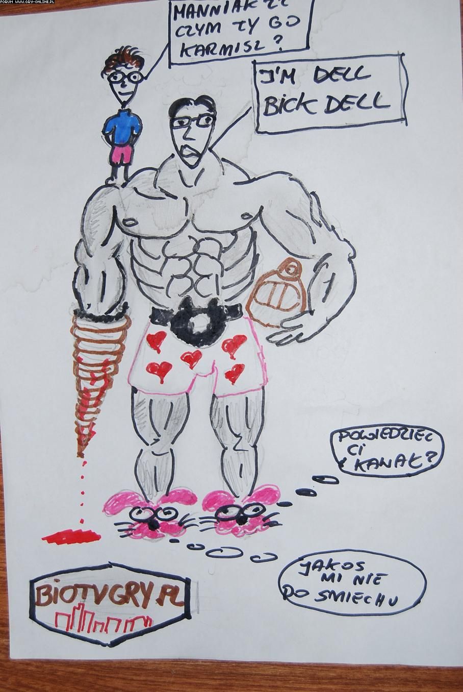 kwiatekbrn no widzisz jest jasno żeby przerysować. ok ale tego co jest na obrazku . tego co dali nam na wzór . w dodatku jest to tapeta a nie już gotowy szkic , a ty już strzelasz focha i mówisz jak to zacne słowo "żal" bo żeś znalazł narysowany obrazek w necie i żeś przerysował. no sorry , a to ze darko530 ma podobny do tego co ty dałeś to co z tego ?? po prostu potrzebował więcej szczegółów bo sorry ja na pamięć nie znam dokładnie budowy bigdaddiego. wiec najpierw pomysł bo twoje rysunki to tak jak ja bym sobie znalazł jakiś ciekawy śmieszny projekt naszkicowany i ja bym go po prostu przerysował i dal jako swoje . I co ty myślisz ze robisz łaske nam wszystkim ze bierzesz udział w tym konkursie ??