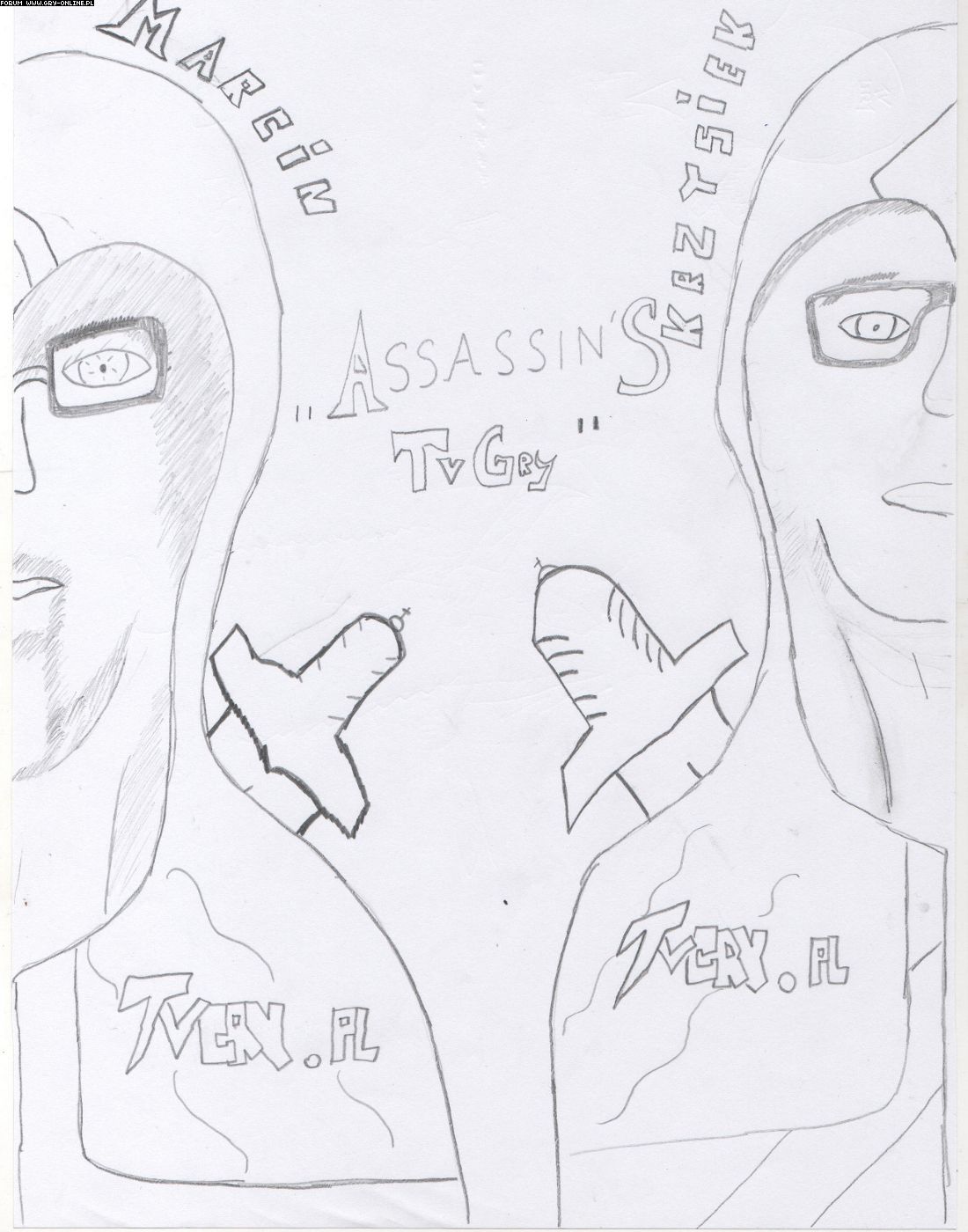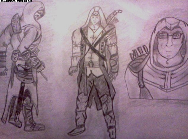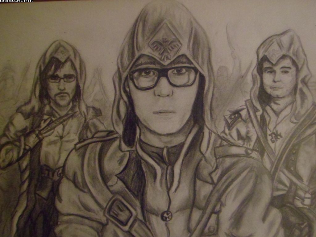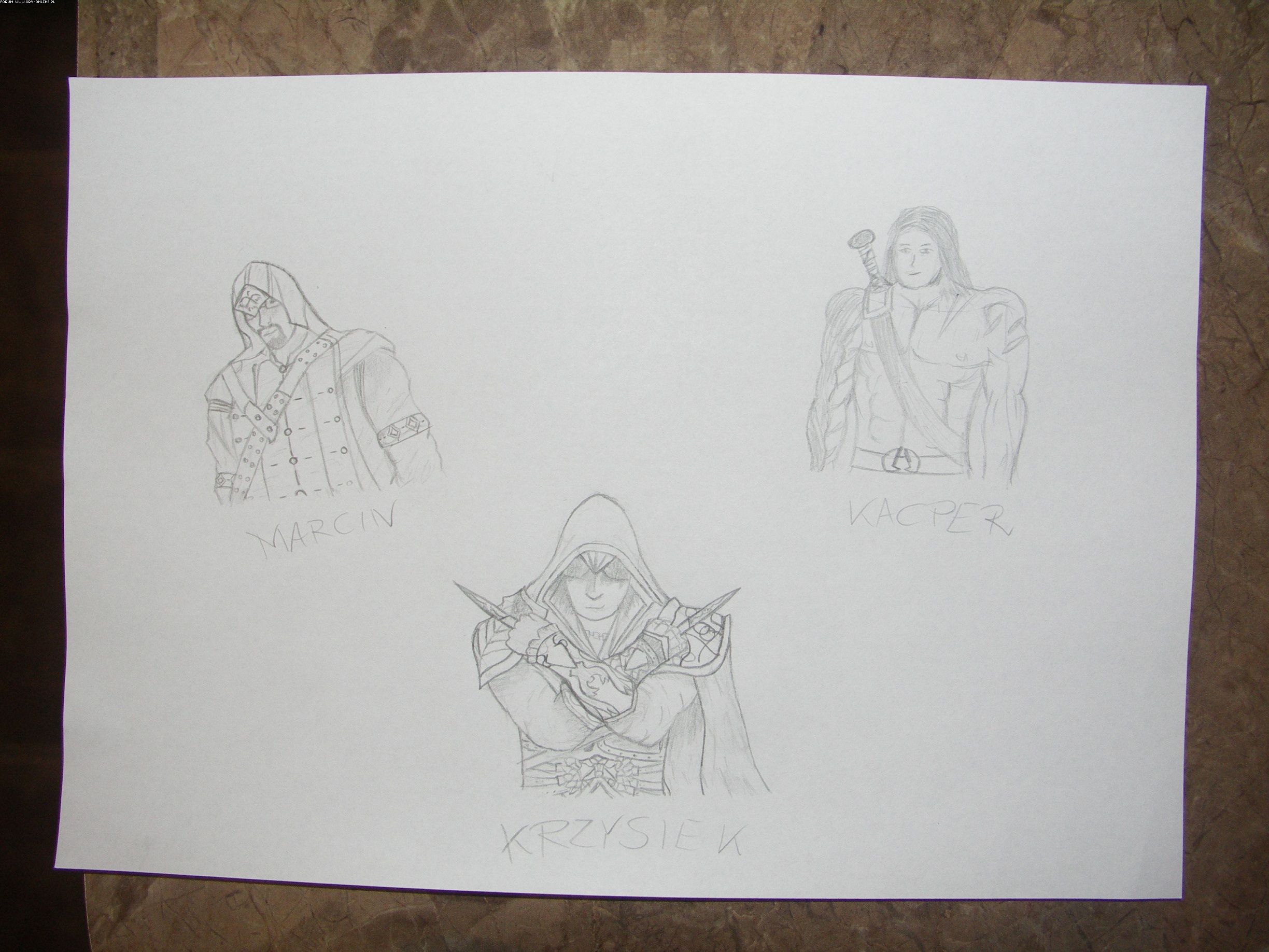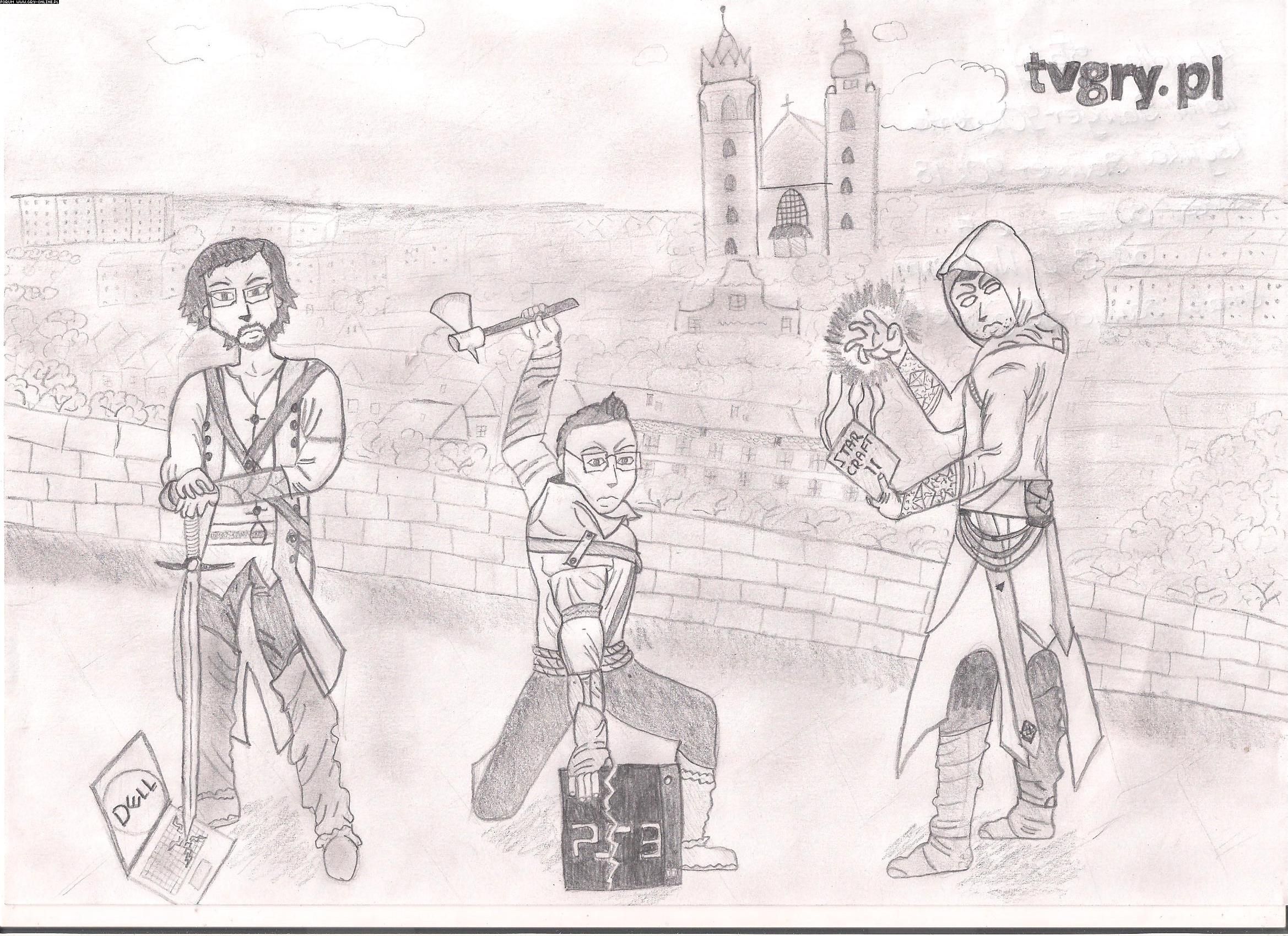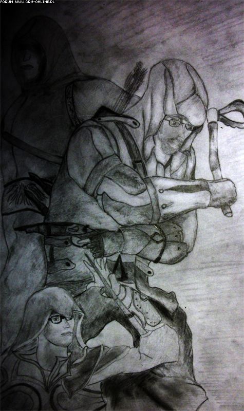 Człowiek się stara a potem :( Fajnie mi wyszło i wgl. a potem musiałem wszystko zepsuć dlatego,że skaner nie odczytywał narysowanego ołówkiem.A tak się starałem bo bardzo chciałem wygrać ten zestaw (bo spoko jest i przydało by mi się coś takiego fajnego) i chciałem poprawić pastelem i się zrypało ,ale wstawiam i zostawiam do waszej oceny.Mieli to być assassyni przyszłości a co najmniej teraźniejszości tzn. zamiast mieczy czy sztyletów mają kontrolery PS3 a Krzysiek trzyma w ręku fona.Szkoda ,że się tak stało ,że moja praca jest zniszczona.Narysował bym coś lepszego ,ale do środy nie będę miał neta a nie wiem do kiedy trwa konkurs.
