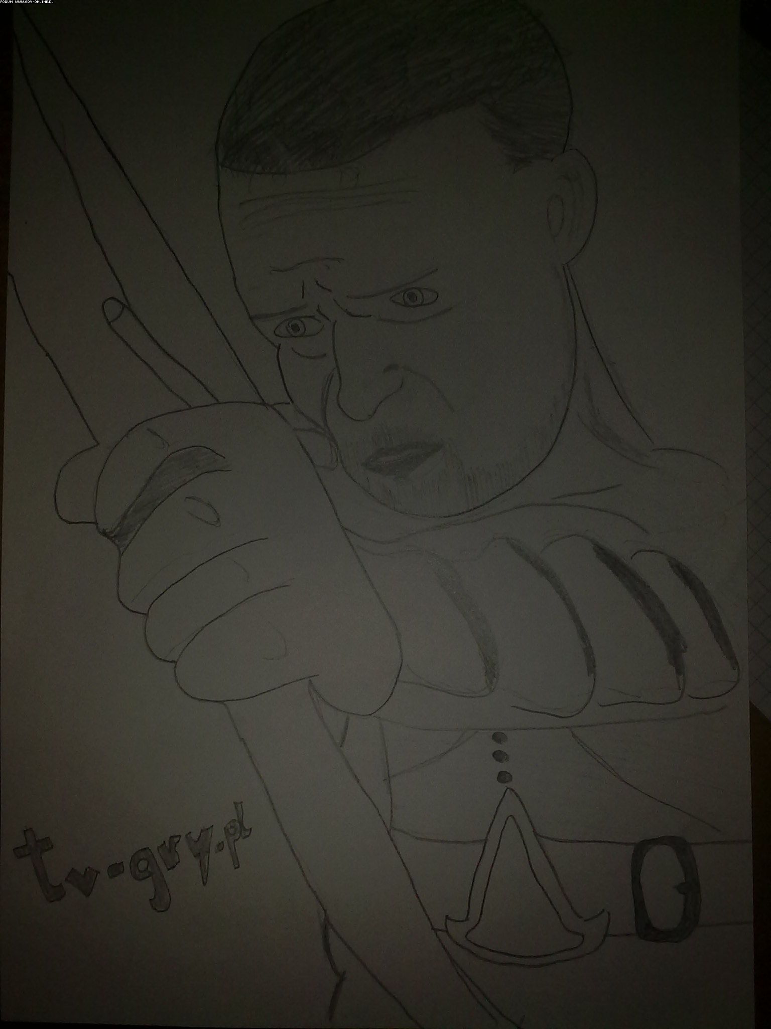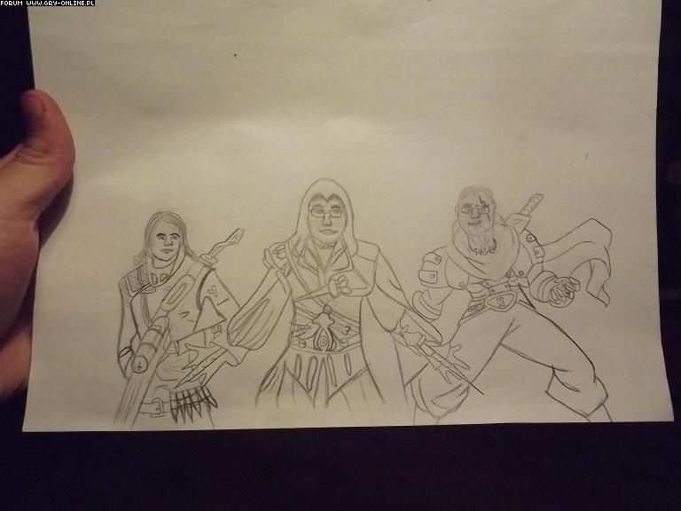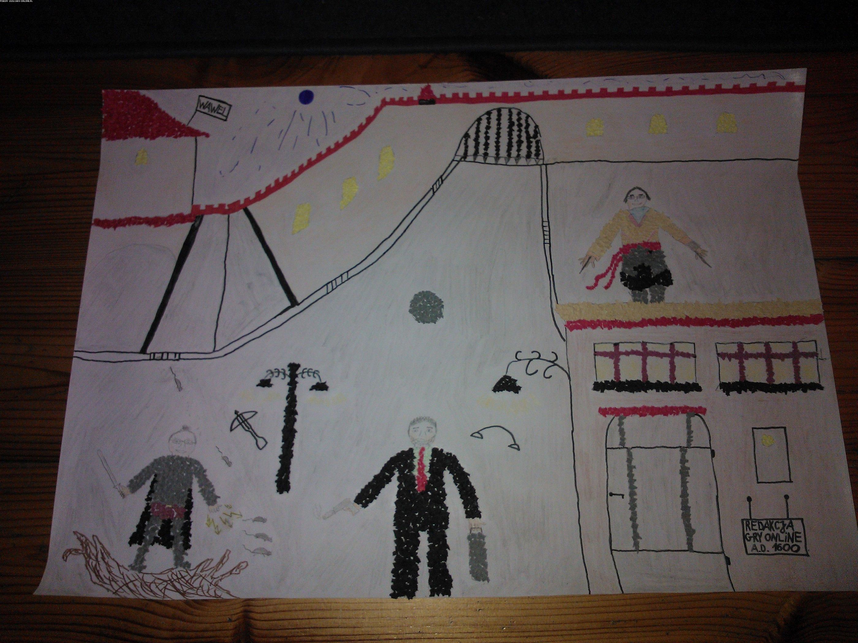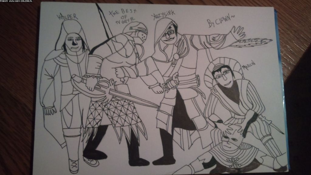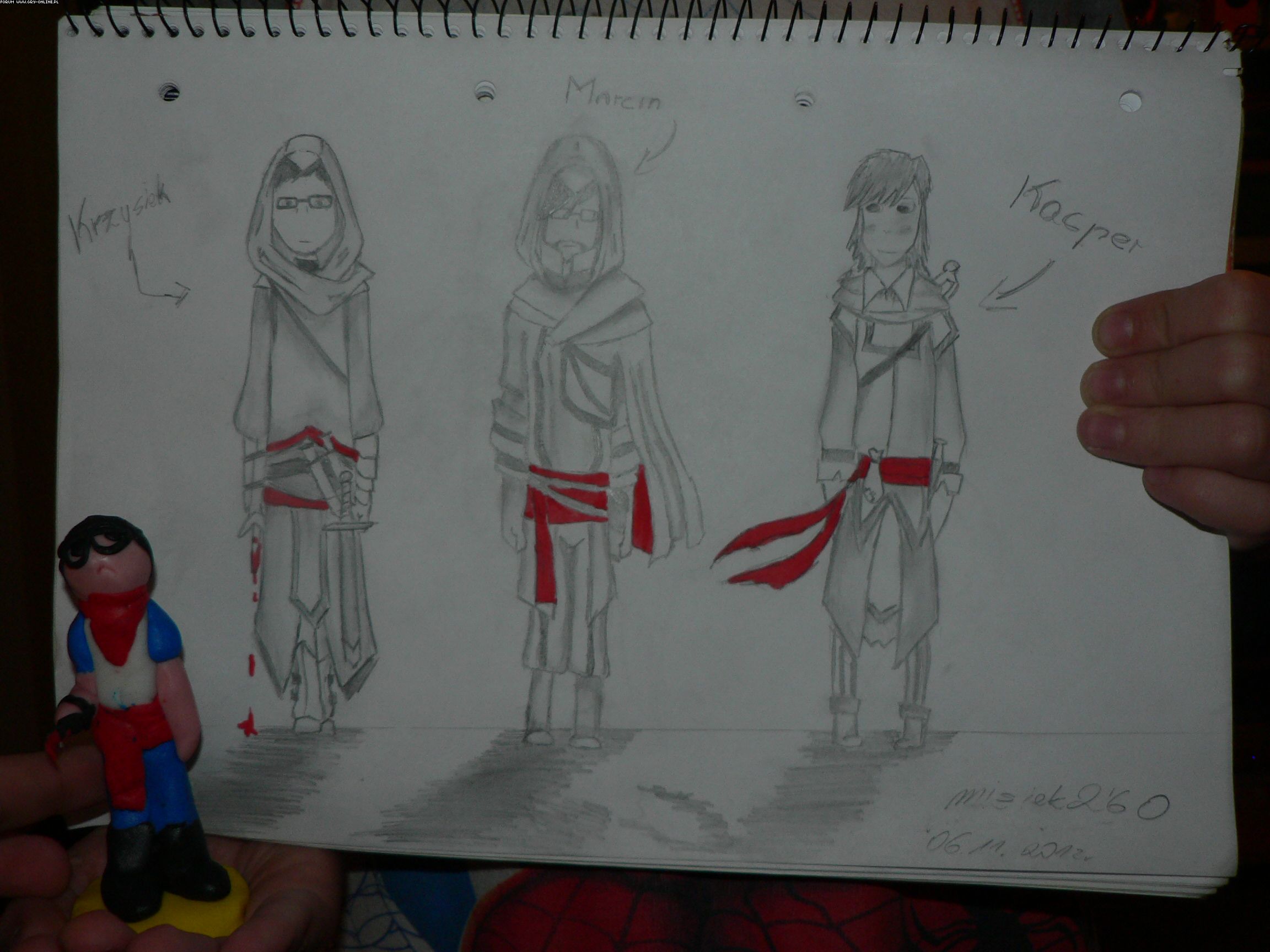 Człowiek się stara a potem :( Fajnie mi wyszło i wgl. a potem musiałem wszystko zepsuć dlatego,że skaner nie odczytywał narysowanego ołówkiem.A tak się starałem bo bardzo chciałem wygrać ten zestaw (bo spoko jest i przydało by mi się coś takiego fajnego) i chciałem poprawić pastelem i się zrypało ,ale wstawiam i zostawiam do waszej oceny.Mieli to być assassyni przyszłości a co najmniej teraźniejszości tzn. zamiast mieczy czy sztyletów mają kontrolery PS3 a Krzysiek trzyma w ręku fona.Szkoda ,że się tak stało ,że moja praca jest zniszczona.Narysował bym coś lepszego ,ale do środy nie będę miał neta a nie wiem do kiedy trwa konkurs.