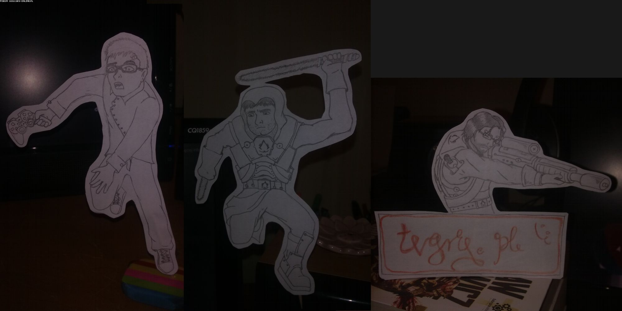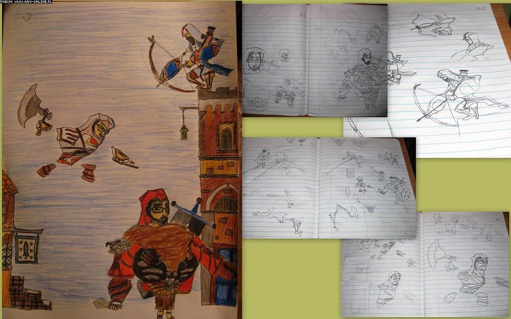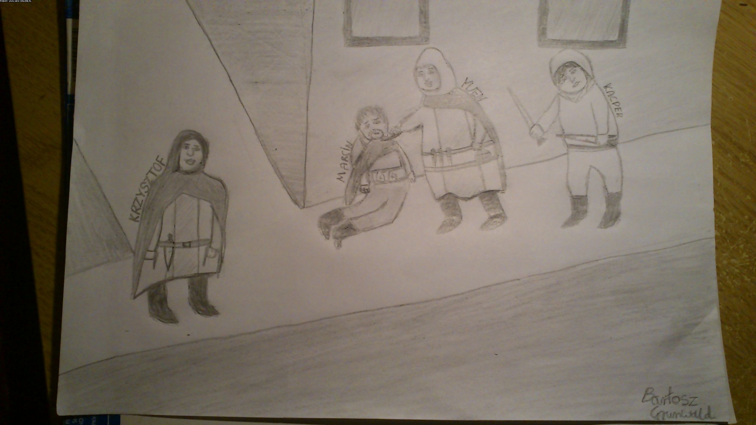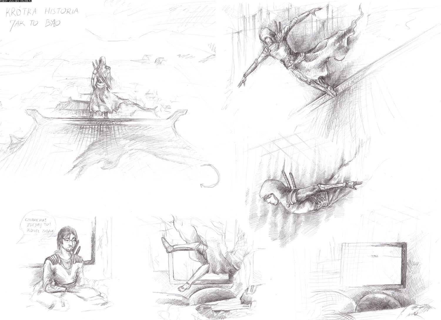 Człowiek się stara a potem :( Fajnie mi wyszło i wgl. a potem musiałem wszystko zepsuć dlatego,że skaner nie odczytywał narysowanego ołówkiem.A tak się starałem bo bardzo chciałem wygrać ten zestaw (bo spoko jest i przydało by mi się coś takiego fajnego) i chciałem poprawić pastelem i się zrypało ,ale wstawiam i zostawiam do waszej oceny.Mieli to być assassyni przyszłości a co najmniej teraźniejszości tzn. zamiast mieczy czy sztyletów mają kontrolery PS3 a Krzysiek trzyma w ręku fona.Szkoda ,że się tak stało ,że moja praca jest zniszczona.Narysował bym coś lepszego ,ale do środy nie będę miał neta a nie wiem do kiedy trwa konkurs.