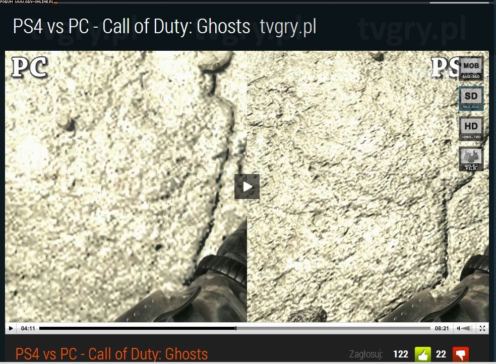 pomijajac wasza srednio zmontowana konfiguracje to Ghosts jest powszechnie uznane za gre zle zoptymalizowana zarowno w czasie gry jak i nawet przy wspomnianych w materiale loadingach. Activision mamilo "specjalnym dopieszczeniem" PC a na absolutnym maxie gra wyglada srednio mimo to zdarza sie jej przycinac bez powodu. niemniej jednak z materialu widac ze PS4 jest ladniejsze. po drugim materiale widze ze kolory itp sa standarowo ladniejsze i wystarczyloby zwiekszyc saturacje itp w ustawieniach nvidii i efekt bylby podobny no ale skoro w zalozeniach nic nie zmieniacie jako "niedzielni gracze" to tak to wyglada.