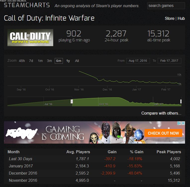Setki tysięcy graczy na serwerach w Call of Duty Infinite Warfare ? No na pewno nie na steamie xD Wątpię by na windows store było lepiej. Co do konsoli to nie mam danych.