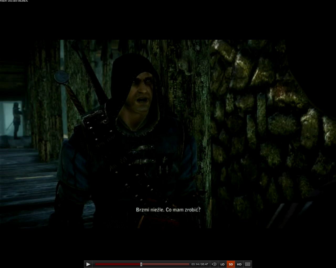 Zwróćcie uwagę na tragiczny model twarzy Geralta podczas dialogów a szczególnie w trakcie przyjmowania zadanie od zielarza. Wiedźmin wygląda tam jak jakiś tłustawo zielonkawy potwór z bagien. Na dodatek oczy przeszklone o tępym wyrazie sprawiające wrażenie podbitych.